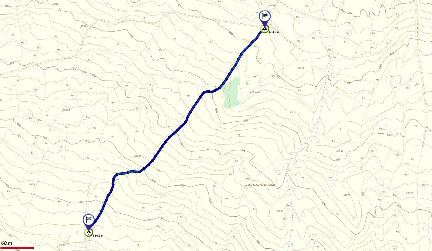 El primer tramo de este ramal toma una trayectoria descendente en dirección sur por un camino de herradura en el que lo primero que llama la atención es la presencia de un par de bosquetes de pinos. El primero se ubica en el paraje conocido como La Cueva y, algo más adelante, aparece el segundo en la ladera oeste de la montaña de La Cueva. Estos bosquetes ponen en evidencia dos aspectos clave: por un lado, el papel ecológico que juega el cuervo (Corvus corax canariensis) en el pinar, del mismo modo que en el sabinar, como elemento de dispersión de sus semillas y, por otro lado, las dificultades que tiene cualquier especie, en este caso el pino canario (Pinus canariensis), para prosperar y expandirse sin ayuda de ningún tipo fuera de los límites de su área de distribución potencial o en condiciones extremas. Este último aspecto sirve, además, de analogía para entender las duras condiciones de vida por las que subsistieron los hombres y mujeres de El Pinar que habitaron este remoto y desolado paraje en el pasado. El tramo finaliza a la altura de una antigua casa de arquitectura tradicional, en ruinas, dotada de un aljibe para la recogida y almacenamiento del agua de lluvia.