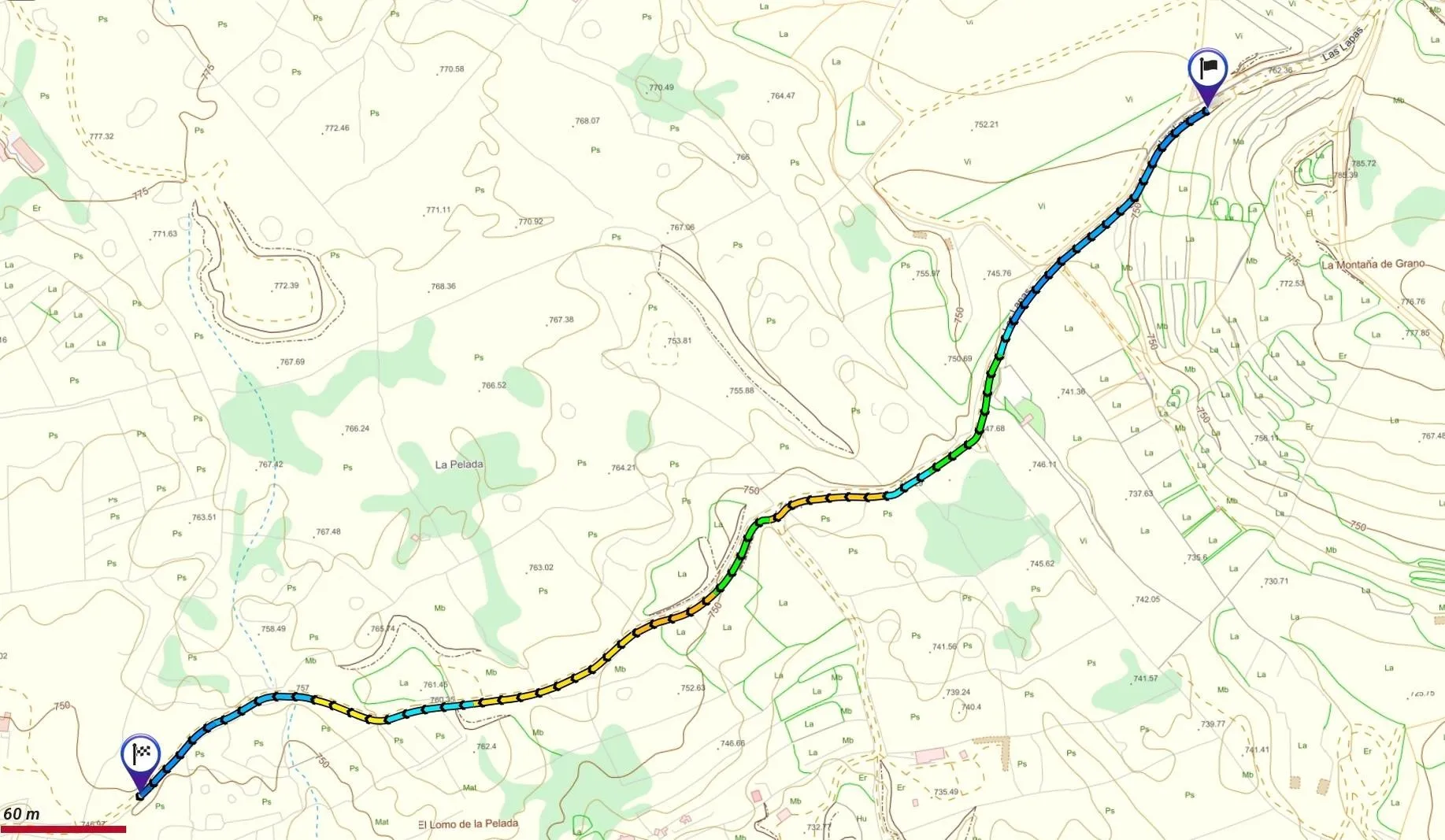 A medida que nos adentramos en este tramo, nos alejamos de la montaña de Grano (al sureste) y de la zona conocida con el nombre de Las Lapas (al noreste) y la pista de cemento se convierte en una pista de tierra. Dicha pista se adentra en una área conocida como La Pelada donde el pinar canario (Pinus canariensis) ha conseguido recuperar parte de su dominio en las proximidades del límite inferior de su distribución potencial a consecuencia del abandono que ha sufrido la actividad agraria en dicha zona en tiempos históricos. Sin embargo, entre los pinos y el matorral de tabaibas (Euphorbia lamarkii), berodes (Kleinia neriifolia) y calcosas (Rumex lunaria) que ha recuperado paulatinamente su espacio aún es posible distinguir algunos almendros (Prunus dulcis) e higueras (Ficus carica) resistiéndose a desaparecer del lugar.